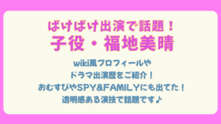 エンタメ 【ばけばけ子役wiki】福地美晴のドラマ出演歴は?アーニャやおむすびなど好演!磯村アメリに似てる? 今、NHK朝ドラ『ばけばけ』でヒロイン松野トキの幼少期を熱演し、全国で話題沸騰の福地美晴(ふくち みはる)さん。舞台『SPY×FAMILY』アーニャ役やドラマ『おむすび』など多彩な作品で魅力を放ち、「磯村アメリに似てる?」とネットでも注目が... 2025.10.14 エンタメ