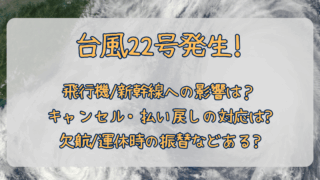 台風 台風22号2025飛行機/新幹線への影響は?キャンセル/払い戻し対応まとめ!欠航/運休時は振替ある? 2025年10月5日、台風22号が発生しました。すでに日本列島の南海上を北上中で、進路次第では三連休や出張・旅行シーズンの交通に大きな影響を及ぼす可能性があります。この記事では、台風22号の最新進路予想飛行機・新幹線への影響欠航・運休時のキ... 2025.10.05 台風