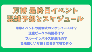 おでかけ 万博閉幕日のイベント混雑予想!コブクロ登場いつ?ブルーインパルス飛ぶ?13日のスケジュールまとめ 2025年10月13日、大阪・関西万博はいよいよ閉幕を迎えます。最終日の大型イベントはEXPOアリーナ「Matsuri」で行われますが、すでに優先観覧チケットの予約は終了しています。また、閉会式は別会場のEXPOホール「シャインハット」で行... 2025.10.07 おでかけ