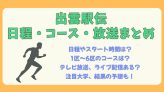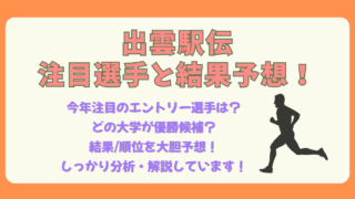 話題 出雲駅伝2025スタート時間とコースまとめ!結果の予想と放送/配信についても 大学三大駅伝の一つ、秋の風物詩「出雲全日本大学選抜駅伝競走」が2025年も島根県出雲市で開催されます。スピード勝負が魅力のこの大会は、今年も全国各地から強豪大学が集結し、熱い戦いが繰り広げられます。この記事では、気になるスタート時間やコース... 2025.10.08 話題