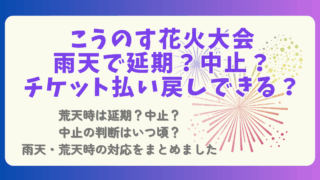 おでかけ こうのす花火大会2025雨天時は中止/延期?開催判断はいつ?払い戻しなど対応についても 2025年10月11日に開催予定のこうのす花火大会。天気予報では小雨がぱらつく可能性があり、開催するかどうか気になりますよね。せっかくチケットを買ったのに中止になるのか、延期はあるのか、払い戻しはどうなるのか不安な方もいらっしゃるでしょう。... 2025.10.10 おでかけ