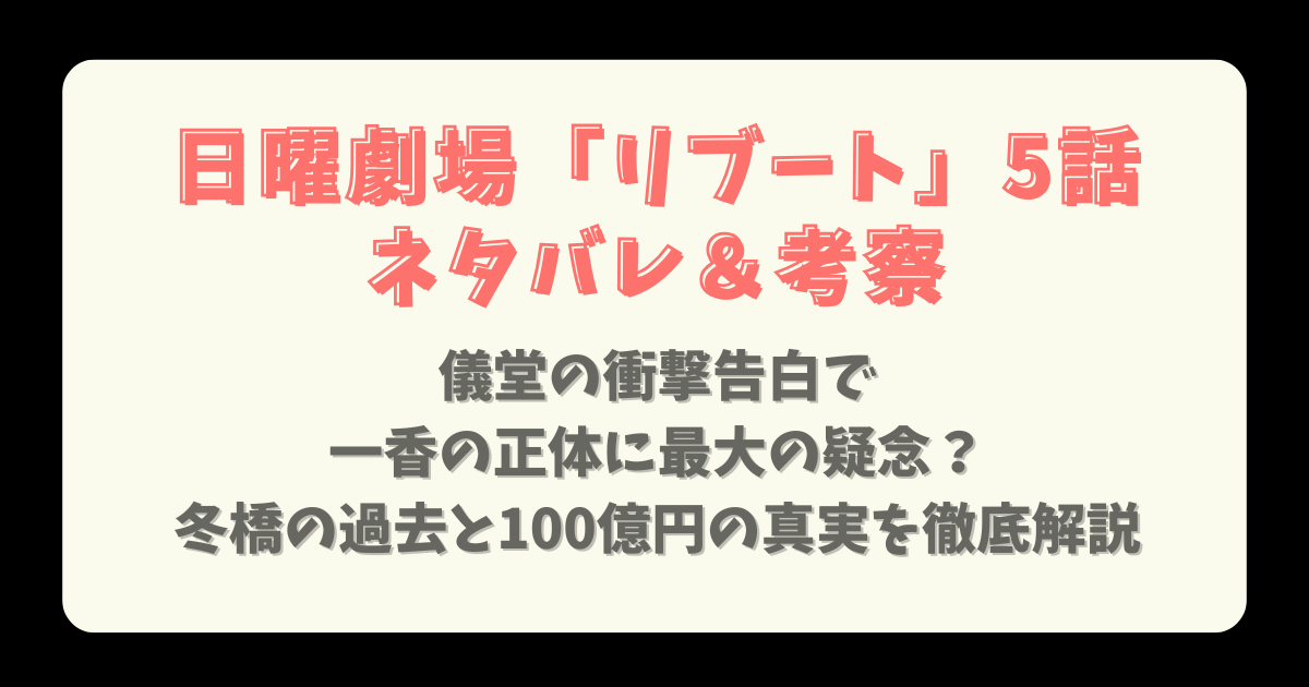 日曜劇場「リブート」第5話「決戦」が、2026年2月22日の夜9時からTBSで放送されました。この回では、早瀬陸と本物の儀堂がついに対面し、一香の裏切り疑惑が一気に膨らむ展開が視聴者を魅了しました。鈴木亮平さんが一人二役を演じる整形と復讐をテーマにしたサスペンスが、最高潮の盛り上がりを見せています。SNSでは「#リブート5話」がトレンド1位を獲得し、驚きの声が溢れかえりました。